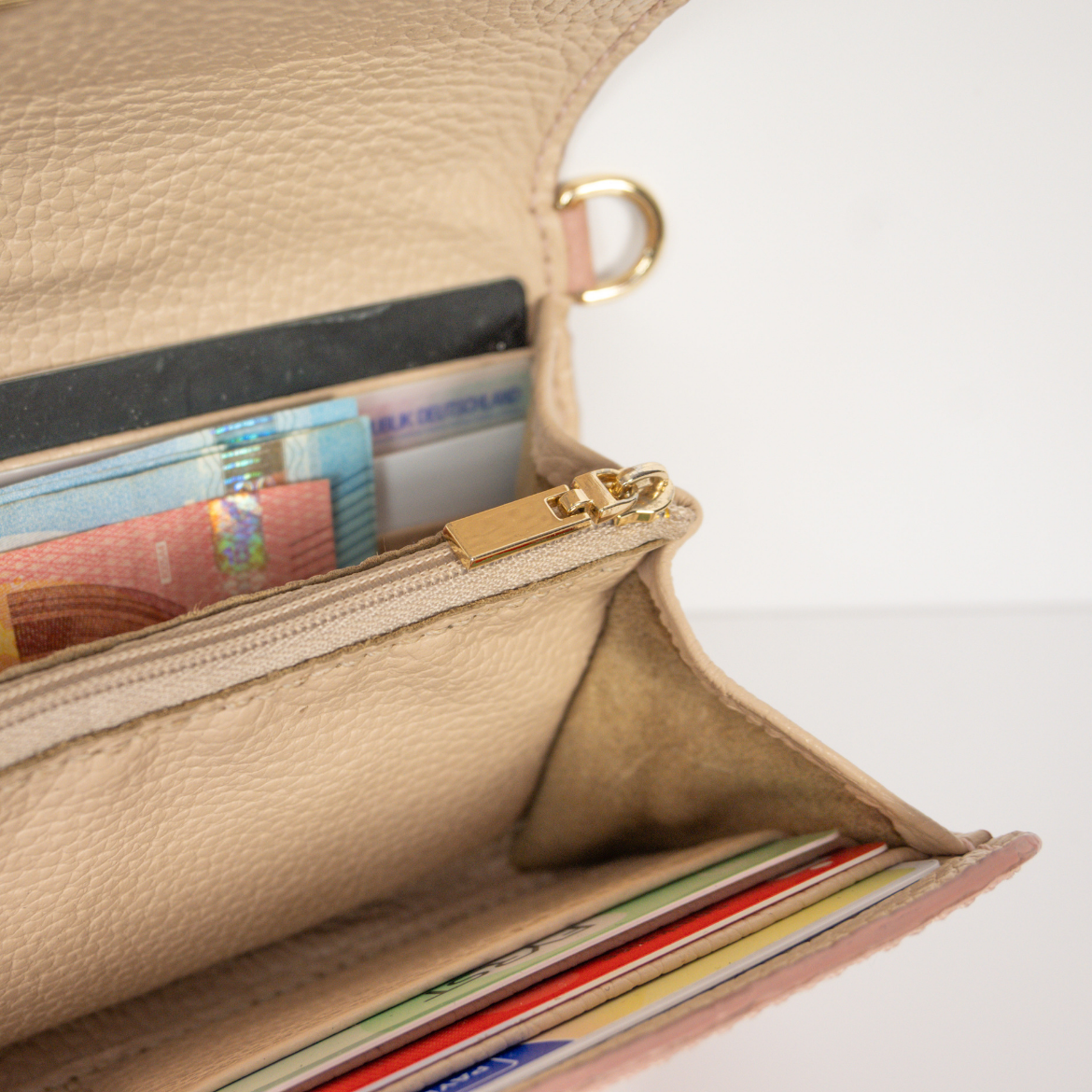 Tu peux porter ton porte-monnaie avec la dragonne en cuir standard ou le combiner avec une sangle ou une chaîne - ou l'utiliser comme un porte-monnaie normal.