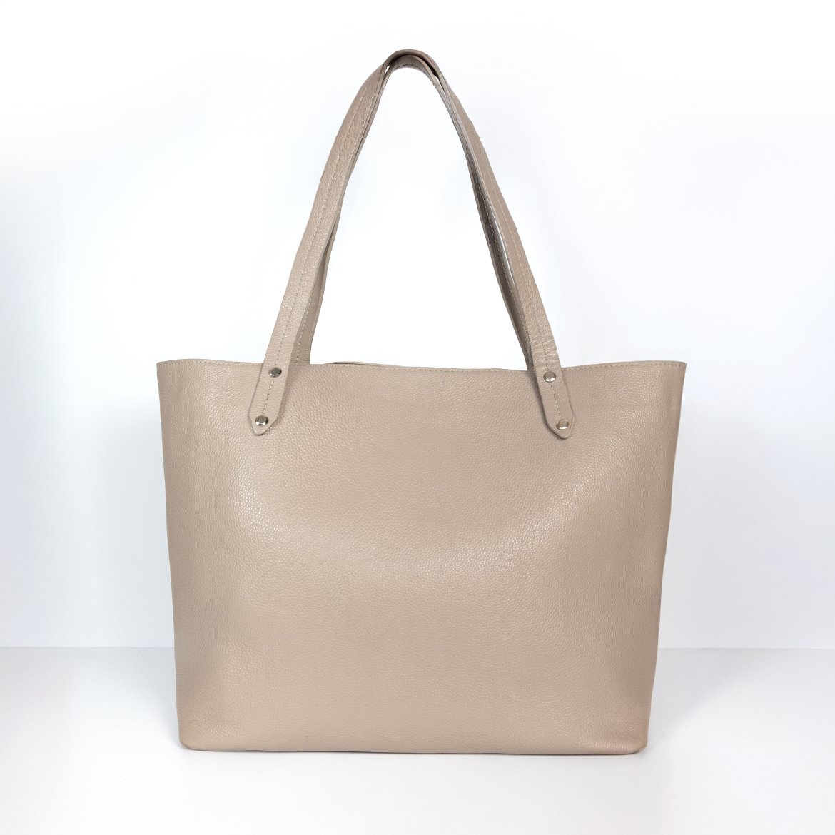 Les anses en cuir du shopper sont fixées au corps du sac par des vis à livre.